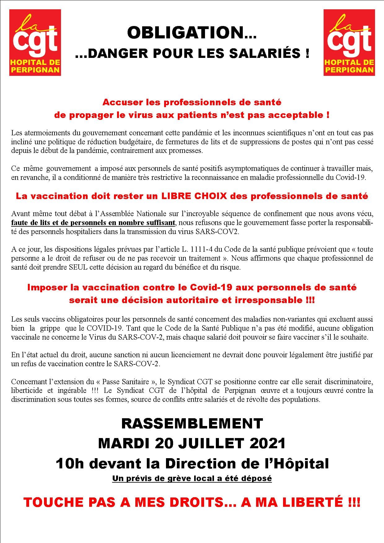 Pour l’amélioration des conditions de travail à l’Hôpital et contre l’obligation de vaccination des personnels de Santé !
