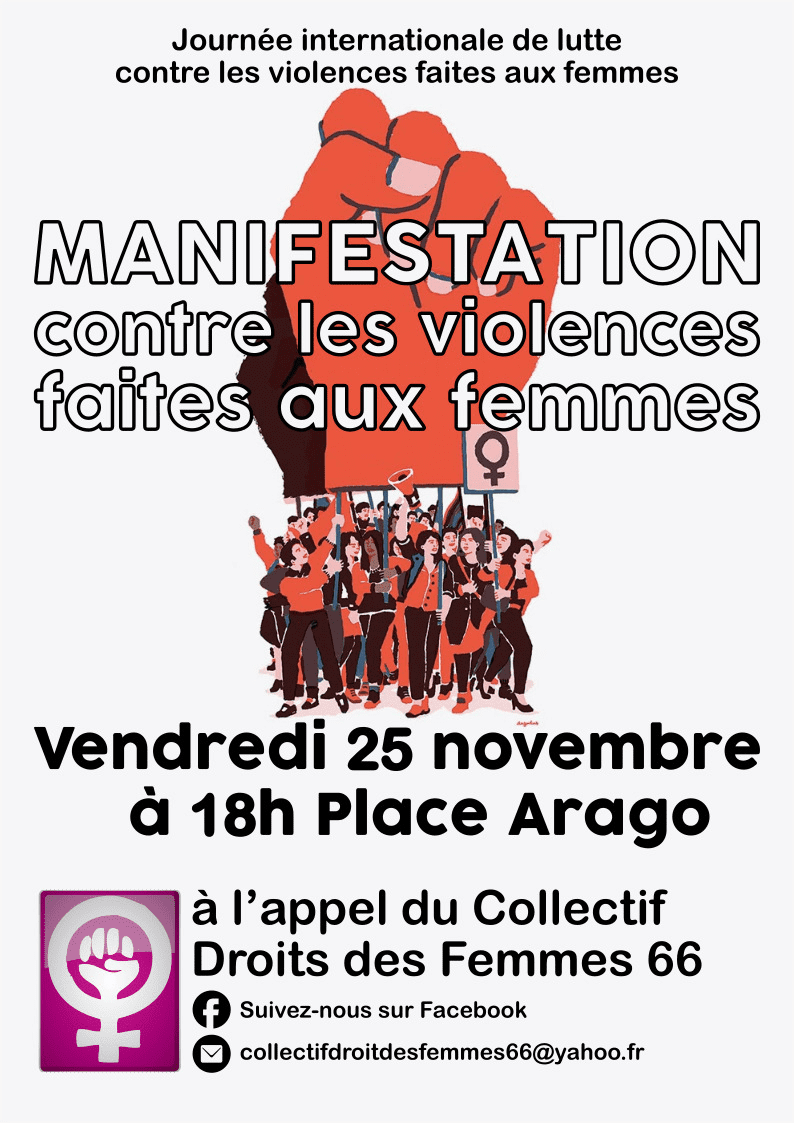 A Perpignan, à l’appel du Collectif Droits des Femmes 66, manifestation à 18h au départ de la Place Arago, puis apéro et film au Casal sur l’APIAF, association toulousaine très investie pour les luttes pour les droits des femmes.